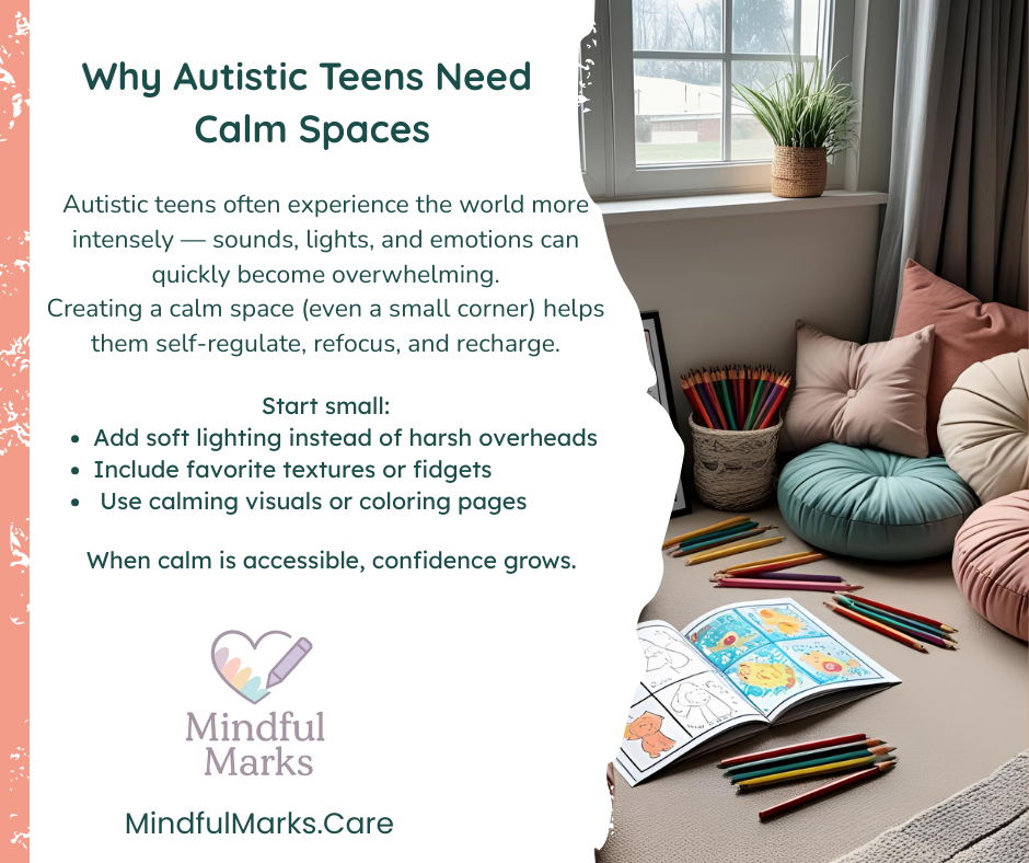 This isn’t just for little kids. Teens and even adults need moments of pause and places to process. For autistic preteens and teens especially, calm corners provide: